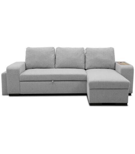 Canapé d'angle convertible 3 places, réversible, avec coffre de rangement et grand pouf. Tablette sur l'accoudoir avec port USB. Revetu de tissu Souris 100% Polyester. Dimensions : L247xP143xH86 cm. Couchage : 132x190x8cm. Densité de la mousse : 25kg/m3 28kg/m3. Matériaux : panneau de particules 10 mm, 15 mm, bois dur 45X22, 22X22, Isorel 2mm, Panneau mélaminé chene-18mm. ...