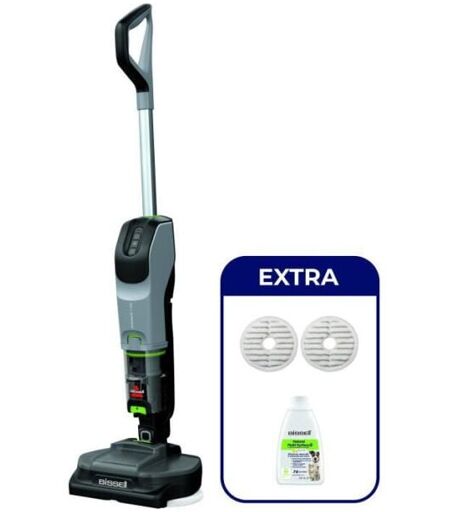 Découvrez le SpinWave + Vac Pet sans fil de BISSELL® : un nettoyeur pratique pour vos sols durs. Idéal pour les foyers avec animaux, il aspire efficacement poils, miettes et saletés grâce a son aspiration cyclonique. Avec lingettes rotatives et détergent multi-surfaces, il élimine les taches sur tous les sols, y compris le bois. ...