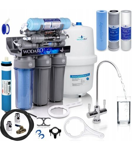 RO7 EauRO GRAPHITE C'est un appareil osmotique complet qui vous permet d'obtenir de l'eau exempte d'impuretés telles que : produits chimiques toxiques et cancérigènes, métaux lourds, bactéries et virus. La perfection du système réside dans l'utilisation de la technologie de traitement de l'eau en 7 étapes, la possibilité de sa déminéralisation et l'ionisation de l'eau. L'eau circulant dans ce système est soumise à 7 étapes de filtration 1. FCPS5-AB - Cartouche Aquafilter en polypropylène spécialisée , fabriquée dans la technologie antibactérienne BACinix . La cartouche peut être utilisée à la place de la cartouche FCPS5 standard - tout en conservant toutes ses fonctionnalités. La technologie BACinix amène la filtration de l'eau à un nouveau niveau. En plus de la filtration mécanique classique, la cartouche a un effet antibactérien et bactériostatique sur les micro-organismes présents dans l'eau. La technologie BACinix utilise des nanoparticules d'argent , un élément bactéricide ...