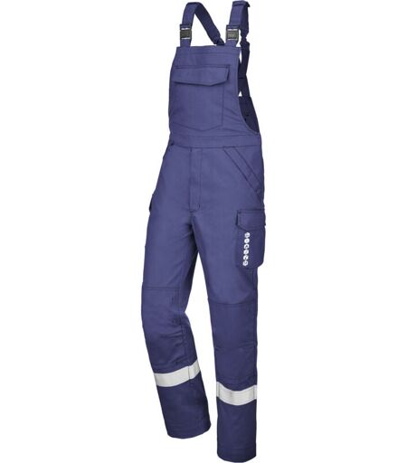 Passants en tissu. Bretelles avec élastique sous tunnel, amovibles et réglables boucles plastiques. Poche poitrine droite sous rabat fermé par pressions cachées. Poches italiennes sous rabat fermé par pression caché. Poches genoux. Ceinture élastiquée. Côtés fermés par bouton clou cachés. Poches cuisses plaquées sur le devant et soufflet sur l'arrière sous rabat fermé par pressions cachées. Bandes rétro-réfléchissantes de 50mm ...