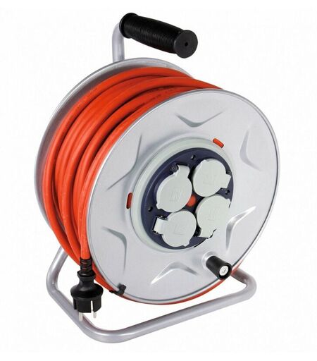 IP44 Puissance maxi enroulée/déroulée : 1100/3200 W Câble : HO7 RN-F Nombre de fils et Section : 3G 2,5 mm² 4 prises 2 P+T 16 A à clapets avec disjoncteur thermique Système roue libre avec moyeu fixe, permet de dérouler le câble sans débrancher les accessoires Câble orange pour une meilleure visibilité Flasques rigides en zinc Poignée de transport ergonomique ...
