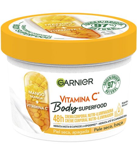 BODY SUPERFOOD MANGUE crème corporelle nutri-illuminatrice pour peaux sèches et ternes. Hydratant pour le corps. Type de peau: Sèche, Tous types de peaux. Textures: Crème. Green beauty: Ingrédients naturels. Ingrédients: Vitamine C. Les tendances: Vitamina C ...
