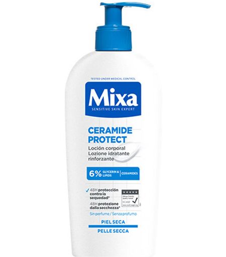 Lait corporel hydratant MIXA CERAMIDE PROTECT pour peaux sèches. Hydratant pour le corps. Type de peau: Sèche, Sensible. Textures: Lotion. Formulation: Hypoallergénique, Sans parfum. Format: Flacon pompe. Les tendances: Ceramidas, Glicerina. Ingrédients: Céramides ...