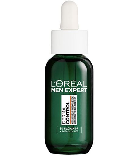 Sérum anti-imperfections MEN EXPERT DERMA CONTROL. Anti-taches - Traitement de l’acné, des pores et des points noirs. Type de peau: Grasse, Avec acné. Textures: Sérum. Format: Flacon pompe. Les tendances: Ácido salicílico, Niacinamida. Ingrédients: Niacinamide ...