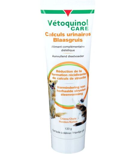 Vetoquinol Care Calculs urinaires est un aliment complémentaire diététique pour chiens et chats. Ce gel appétant aide à diminuer les récidives de calculs de struvite grâce aux propriétés d’acidification de l’urine de la DL-Méthionine. Profitable aux chats atteints du syndrome urologique félin (SUF) et aux chiens sujets à la formation de calculs de struvite.Indications :Chiens et chatsComposition :Sirop de glucose, malt, huile de soja, huile de poisons, mélasse, collagène de porc hydrolysé.Constituants analytiques : Matières grasses brutes 27,4%, Humidité 13,7%, Protéines brutes 4,9%, Cellulose brute 1,7%, Cendres brutes 0,3%, Sodium 0,05%, Potassium 0%, Soufre 0%, Chlorures 0%, Magnésium 0%, Calcium 0%, Phosphore 0%.Additifs/kg : DL-Méthionine (3c301) 80000mg.Conseils d'utilisationEn complément d’une alimentation adaptée : directement dans la gueule de l’animal, mélangé à la nourriture ou à l’eau de boisson. À utiliser sur une période allant jusqu’à 6 mois. Demander l’avis d’un vétérinaire avant utilisation.Dosage :Chats : 1/2 - 1 cuillère à café (3-6 g) 2 à 3 fois par jourChiens : 1/2 - 3 cuillères à café 2 à 3 fois par jour.Conditionnement :Tube de 120 gIl est indispensable de demander l’avis de votre vétérinaire ou de votre pharmacien. Si les symptômes persistent, consultez votre vétérinaire. ...
