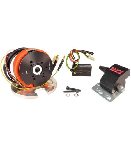 Avec une puissance de 42kv, et jusqu'à 22 000 tours/minute l'allumage digital signé MVT pour les véhicules moteur Minarelli avant 2004, possède une sortie éclairages en 12V et 60W. DD 6 ...