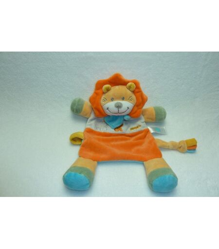 Description du doudou : Doudou plat lion de 30 cm environ de longueur, attache tétine par velcro.Coloris : orange, turquoise, motifs animaux de la jungle. Etat : Neuf sans étiquette boutique. Produit original. DOUDOU DIFFICILE A TROUVER ...