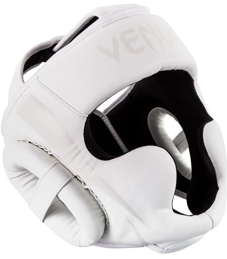 Casque Venum élite Blanc. Venum ajoute du style à sa collection élite, une vrai réussite ! Le casque Venum élite pocure une haute protection et un grand confort. Il laisse une bonne visibilité par rapport à nombreux de ses concurents. Pour une offrir une protection à la hauteur de vos attentes, il a été fabriqué à partir d'un cuir skintex de haute qualité. Fixation irréprochable, léger comme une plume, sa matière en lui confère une grande longévité. En plus de sa solidité le casque Venum élite a été fabriqué avec une triple épaisseur de mousse haute densité pour amortir les coups même les plus puissant, il a été conçu pour les entraînements de niveau avancé. Il offre une large protection sur les zones les plus exposées, boites crânienne, mentons, pommettes, oreilles... Taille unique. Nous recommandons ce produit ! ...