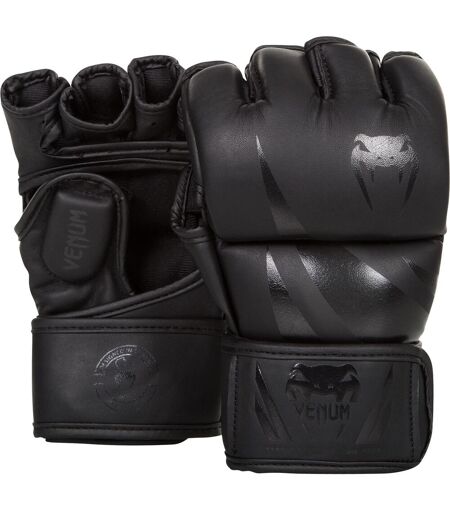 Gants de MMA Venum challenger. Comme à son habitude Venum nous propose un gant de MMA très haute performance avec qui plus est un design 2.0. Avec son design "black édition" ces gants de MMA sont dotés d'un look sobre et terriblement efficace. Fabriqués en Thaïlande dans un PU très haut de gamme, les zones de frappe sont parfaitement rembourrées d'une mousse haute densité, ces gants vous apporteront une protection maximum. Le système de double fermeture vous permettra un ajustement simple et personnalisé. La grande fermeture velcro en cuir diminuera le risque de blessure. Les gants de MMA Venum Challenger sont renforcés au niveau des doigts pour un plus grand confort et une plus grande solidité. Venum propose ici un gant d'entraînement de haut niveau pour un prix tout à fait abordable, bravo Venum ! ...