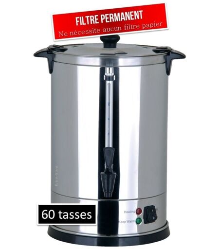 Percolateur à café 60 tasses - Filtre inox permanent - Boîtier inox à double paroi anti-brûlure - Capacité de cuve : 8.8 litres - 2 résistances séparées pour la percolation et le maintien de température - Thermostat de sécurité à réarmement automatique - Robinet anti-gouttes - Indicateur du niveau de remplissage - Repose tasse amovible - Temps de préparation pour 60 tasses : 50 minutes - Puissance : 950 W / 230 V - Dimensions : Ø 210 mm, H 430 mm - Poids : 4,8 Kg ...