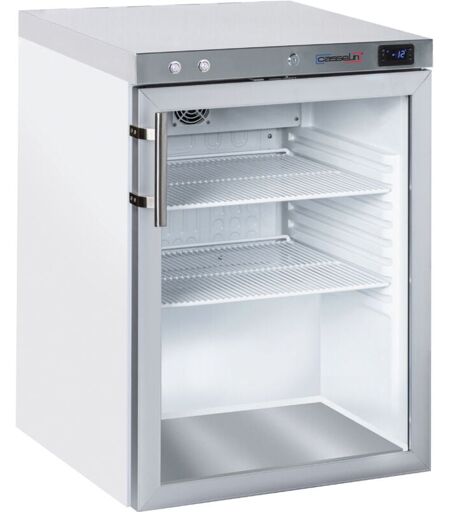 Armoire négative à spiritueux vitrée 140 L Blanche - Plateau en acier inoxydable - Froid ventilé - Isolation de 50 mm par côté - Dégivrage électrique automatique - Éclairage LED - Verrouillage porte par clé - Porte triple vitrage - Bouton ON/OFF - 2 étagères réglables - Thermostat digital avec alarme sonore et visuelle - Alarme porte ouverte et température élevée - Température réglable de -12°C à +5°C - Classe climatique : 3 - Capacité nette : 99 L - Capacité commerciale : 140 L - Fluide réfrigérant : R 290 - Puissance : 230 W / 230 V - Dimensions : L 598 x P 699 x H 839 mm - Poids : 39 Kg ...