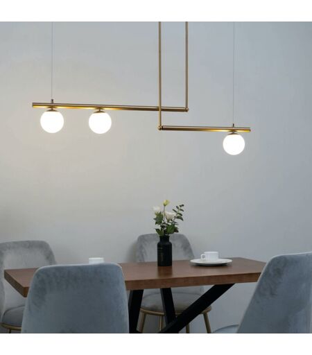 Laissez-vous séduire par Andrea, une suspension d'une élégance incomparable au design ultra moderne. Sa forme géométrique et futuriste en métal doré crée une présence captivante dans votre intérieur. Équipée de trois boules en verre blanc, cette suspension accueille 3 ampoules de culot G9 pour un éclairage efficace et esthétique. Avec ses 120 cm de longueur, elle offre une illumination remarquable sur une grande surface, apportant ainsi une touche de modernité et d'originalité à votre pièce. ...