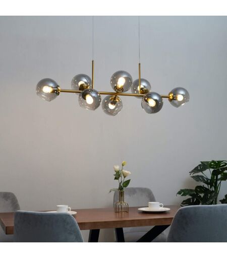 Ajoutez une note moderne et tendance à votre pièce avec la grande suspension Carlotta. Conçue en métal couleur laiton et dotée de sphères en verre fumé, elle mesure 110 cm de long et offre la possibilité d'ajuster sa hauteur. Éclairant de manière homogène avec ses 8 ampoules E27, elle est parfaite au-dessus d'une table ou au centre d'une pièce à vivre. L'association du laiton et des sphères en verre fumé en fait un luminaire décoratif pour une décoration moderne. ...