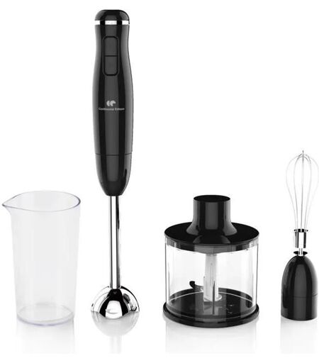 CONTINENTAL EDISON CEHB01 Mixeur Plongeur Coloris : Noir - Puissance : 220-240 V /50/60Hz - 400 W - Mélangeur a main - Bouton / interrupteur turbo - Avec arbre en métal - Moteur DC - Hachoir 600ML - Bécher 550ML - Fouet ...