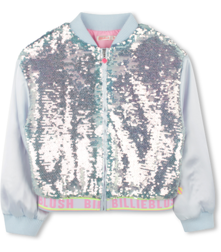 Ce blouson Billieblush se pare de reflets brillants pour égayer le quotidien. Les manches satinées contrastent avec le corps orné de sequins. Le col et les poignets sont en bord-côte pailleté. La taille élastiquée est décorée du logo de la marque. BILLIEBLUSH, BEACH GLASS, Outlet, ETE 2025. ...