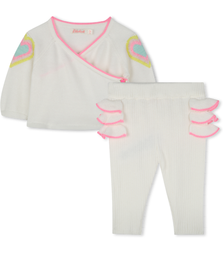 Cet ensemble Billieblush composé d'une brassière et d'un pantalon est confortable et pratique. La brassière comporte une fermeture croisée pour un enfilage aisé. Deux coeurs multicolores ornent les épaules. Le pantalon se dote d'une taille élastiquée et de volants dans le dos. BILLIEBLUSH, 121, Outlet, ETE 2025. ...