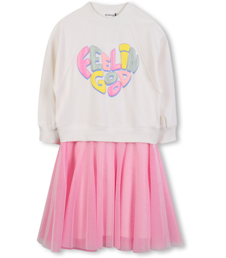 Cette robe bi-matière BILLIEBLUSH allie confort et style avec son haut en molleton doux, doté de bords-côtes aux poignets, au col et dans le bas. L'illustration fantaisie avec encre gonflante sur le devant ajoute une touche ludique et originale. Le bas évasé en tulle apporte une dimension aérienne et raffinée à cette pièce chic et décontractée. BILLIEBLUSH, RICE, Robes de créateur pour fille, HIVER 2025. ...