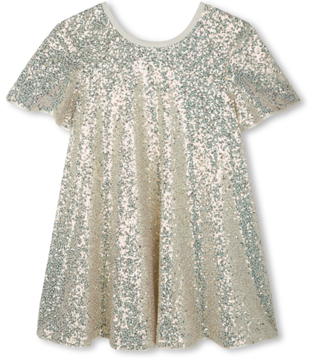 Étincelante, cette robe de cérémonie Billieblush se prête à toutes les occasions festives. Sa coupe toute en fluidité s'accompagne de manches courtes volantées et d'un décolleté au dos. Dotée d'une étiquette rayée, elle est entièrement ornée de sequins. BILLIEBLUSH, Z41, Outlet, ETE 2025. ...