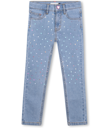 Ce pantalon en denim BILLIEBLUSH, à la coupe slim, combine confort et brillance avec ses pois brillants sur les jambes. Les cinq poches ajoutent une touche pratique, tandis que l'étiquette silicone brillante au dos et la taille ajustable assurent un ajustement parfait. La fermeture braguette complète ce modèle moderne et tendance. BILLIEBLUSH, DOUBLE STONE+BROSSAGE, Pantalons, HIVER 2025. ...
