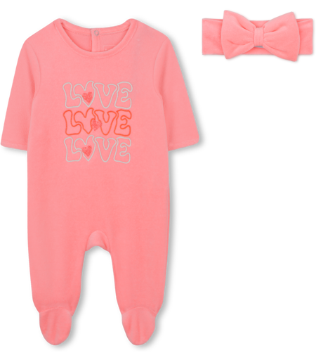 Un pyjama tout doux signé BILLIEBLUSH, en velours contenant du coton issu de l'agriculture biologique. Il se distingue par son imprimé "LOVE" plein de tendresse, une fermeture à pressions pratique au dos et un bandeau assorti. Une tenue idéale pour des nuits câlines et stylées. BILLIEBLUSH, PECHE, Grenouillères et Ensembles, HIVER 2025. ...