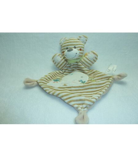 Description du doudou : Doudou plat ours Nicotoy, forme losange 32 cm environ de longueur. Coloris : rayures marron blanc, écharpe verte, motifs oiseau, canard etoiles. Doudou super doux. Etat : Neuf sans étiquette boutique. Produit original. DOUDOU DIFFICILE A TROUVER ...