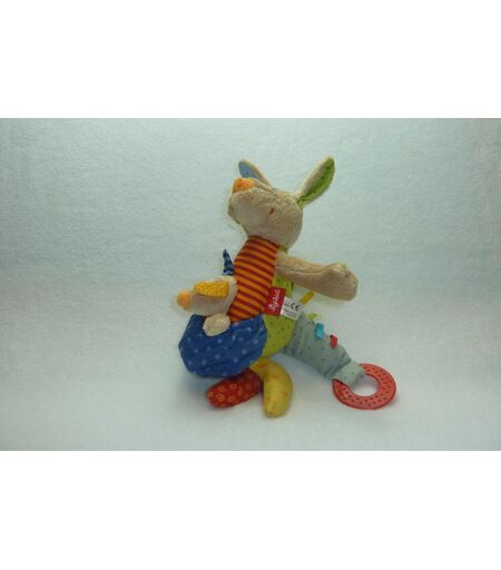 Description du doudou : Doudou peluche kangourou Sigikid, 26 cm environ sans les oreilles, anneau de dentition, fonction vibrant, matière bruissante, pouet pouet, grelot. Coloris : multicolore. Doudou super doux. Etat : Comme neuf. Produit original. DOUDOU DIFFICILE A TROUVER ...