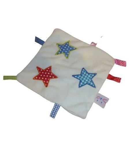 Doudou carré plat bordé d'étiquettes 19x18 cm environ, blanc motif étoiles. Etat : Occasion Comme neuf. DOUDOU DIFFICILE A TROUVER. ...