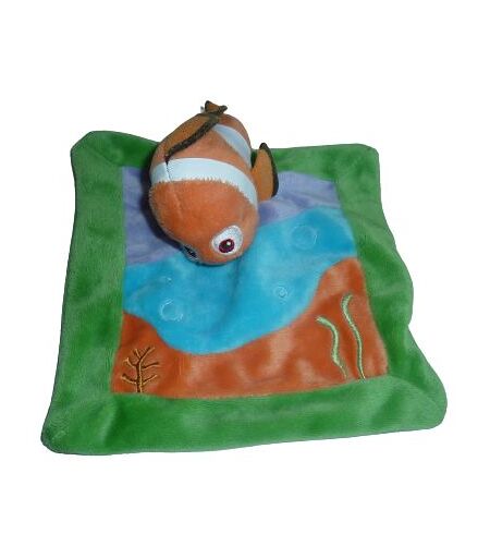 Doudou Poisson Nemo carré de 18x18 cm environ et sur le dessus la petite peluche Nemo. Etat : Comme neuf. DOUDOU DIFFICILE A TROUVER ...