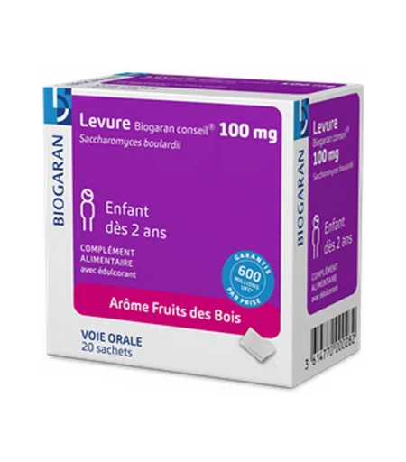 Biogaran Levure 100 mg est constituée de levures revivifiables et ne doit pas être mélangée avec un liquide ou un aliment trop chaud (plus de 50°C). Dosage garanti à 600 millions exprimé en Unités Formant Colonies (UFC) lors de l' utilisation du produit, sous réserve de respecter les conseils de conservation et la date d' utilisation optimale. Complément alimentaire indiqué, en complément de la réhydratation, dans le traitement symptomatique d'appoint de la diarrhée chez l'adulte et l'enfant de plus de 2 ans. ...