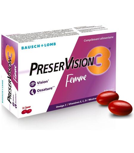 Complément alimentaire à utiliser dans le cadre d'une alimentation variée, équilibrée et d'un mode de vie sain.Le vieillissement peut avoir des répercussions importantes, en particulier chez les femmes. L’œil, en raison de son exposition à la lumière, et les os qui se fragilisent avec l’âge, notamment après la ménopause, en sont des cibles privilégiées. Les Oméga-3 tels que le DHA, les vitamines et minéraux tels que la vitamine C, la vitamine E, la vitamine D, le Zinc, mais aussi les caroténoïdes tels que la lutéine et la zéaxanthine sont importants pour la vision et l'ossature. Bausch&Lomb,; expert en ophtalmologie, a développé un complément alimentaire spécialement adapté aux besoins des femmes de 50 ans et plus : PreserVision3 Femme.Ce complément alimentaire est un concentré d'actifs nutritionnels, contenant les nutriments aux doses recommandées : - le DHA et le Zinc, qui contribuent au maintien d’une fonction visuelle normale.- l’effet bénéfique est obtenu par la consommation journalière de 250 mg de DHA.- les Vitamines C, E et le Zinc, qui aident à protéger les cellules contre le stress oxydatif. - la vitamine D contribue au maintien d’une ossature normale, à une absorption et à une utilisation normales du calcium et du phosphore.IngrédientsHuile de poissons riche en Oméga-3 (DHA) – Gélatine de poisson – Acide ascorbique (Vitamine C) – Agent plastifiant : glycérol (E422) – Suspension de lutéine 20% issue de fleurs de Marigold (Tagetes erecta) dans l’huile de carthame – d,l-alpha tocophéryl acétate (Vitamine E acétate) – Épaississants : mono et diglycérides d’acides gras (E471) – Sulfate de zinc – Eau – Épaississant : dioxyde de silice (E551) – Suspension de zéaxanthine 14% issue de fleurs de Marigold (Tagetes erecta) dans l’huile de carthame – Colorants : oxydes de fer rouge et jaune (E172) – Cholécalciférol (Vitamine D3).Conseils d'utilisations2 capsules par jour pour une supplémentation continue. Avant d’avaler la première capsule, avalez une gorgée d’eau. Ensuite, avalez les capsules entières, une par une, avec un verre d’eau, un peu avant un repas. En cas de troubles de la déglutition, il est recommandé d’utiliser Preservision3 Stick (microgranulés orodispersibles). Précautions d'emploiPreserVision 3 Femme contient de l’huile de poisson (source naturelle d’Oméga3), pour éviter tout reflux, il est conseillé :D’éviter la prise de PreserVision 3 Femme avec une boisson chaudeDe prendre PreserVision 3 Femme de préférence au cours d’un repas afin de faciliter son absorption, avec un verre d’eau froide.PreserVision 3 Femme est à utiliser en complément d’une alimentation variée, équilibrée et d’un mode de vie sain. Il convient d’être régulier dans le suivi et la prise quotidienne de votre PreserVision 3 Femme, pour une supplémentation continue. L’intérêt d’une supplémentation ne se fait pas sur un jour, une semaine ou un mois, mais sur du long terme : l’hygiène de vie est importante au long cours pour préserver le plus longtemps possible une... ...