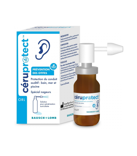 Pour les nageurs, le laboratoire Bausch & Lomb propose une solution de pulvérisation auriculaire qui forme une barrière protectrice contre les facteurs environnementaux extérieurs, tels que l'eau. Cette solution filmogène hydrate et apaise le conduit auditif. Ceruprotect est un dispositif médical qui aide à prévenir les otites, qui réduit le gonflement du conduit auditif grâce à ses propriétés astringentes et qui contribue à maintenir une humidité optimale dans le conduit auditif. Ce produit est particulièrement recommandé pour la prévention des otites et la protection du conduit auditif lors des activités comme la baignade en mer ou en piscine. Il convient aux enfants à partir de 24 mois. ...