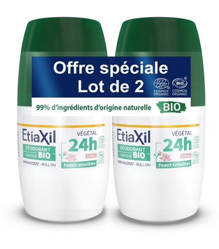 ETIAXIL - Déodorant Végétal Certifié BIO Parfum Lotus 24H Aisselles Adapté aux peaux sensibles Roll-on 50ml Lot de 2 Rouleau 100 ml