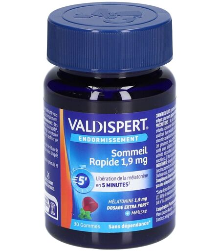 Complément alimentaire à utiliser dans le cadre d’une alimentation variée, équilibrée et d’un mode de vie sain.Prenez le contrôle de votre sommeil et offrez-vous enfin le sommeil dont vous avez besoin, avec Valdispert® Sommeil Rapide 1,9 mg.Ce complément alimentaire fait partie de la gamme Valdispert® Endormissement : des produits spécialement conçus pour favoriser un endormissement plus rapide1.Grâce à sa forme de comprimé orodispersible, il libère la mélatonine en 1 minute, favorisant une action rapide dans l'organisme.(1) La mélatonine aide à réduire le temps d'endormissement. L'effet est obtenu par la prise d'au moins 1 mg de mélatonine avant le coucher.Les compléments alimentaires Valdispert® sont sans dépendance ni accoutumance connues aux doses recommandées.IngrédientsAgents de charge (mannitol), amidon de maïs, agent de charge (cellulose), mélatonine, antiagglomérant (stéarate de magnésium), arômes (vanille, anis - contient du LAIT).Allergènes : Lait.Valeurs nutritionnellesValdispert® Sommeil Rapide 1,9 mg contient de la mélatonine, qui aide à réduire le temps d'endormissement. Grâce à sa forme orodispersible, il libère 1,9 mg de mélatonine en 1 minute, favorisant une action rapide dans l'organisme.Conseils d'utilisationUne prise facile : un seul comprimé à faire fondre sur la langue, sans eau, 15 minutes avant le coucher.Complément alimentaire à base de mélatonine, ne remplaçant pas une alimentation variée et équilibrée, ni un mode de vie sain.Précautions d'emploiRéservé à l'adulte. N'est pas recommandé pour les personnes souffrant d'une maladie auto-immune ou inflammatoire, d'une maladie épileptique ou asthmatique, aux femmes enceintes ou allaitantes et les personnes souffrants de troubles de l'humeur, du comportement ou de la personnalité. Les personnes sous traitement/surveillance médicale doivent demander un avis médical avant de prendre ce produit. Evitez de consommer ce produit lorsque vous devez effectuer une activité nécessitant une vigilance soutenue (conduite automobile, utilisation de machines,...). Usage ponctuel. Une consommation excessive peut avoir des effets laxatifs.Poids net30 gummiesAdresse du FabricantLABORATOIRE COOPERPlace Lucien Auvert77000 MELUN ...