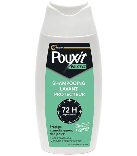 Protégez-vous contre l’infestation des poux lors des périodes à risque comme les vacances scolaires ou la rentrée des classes avec le shampooing lavant protecteur Pouxit Protect.Utiliser le shampooing sur les cheveux mouillés comme un shampooing traditionnel. Appliquer le shampoing et masser les cheveux et le cuir chevelu. Laisser agir pendant 2 minutes. Rincer abondamment à l'eau tiède. Il est recommandé d'utiliser Pouxit Protect Shampooing 72h tous les 3 jours pour assurer une protection optimale. Pour usage externe uniquement. Ne pas utiliser en cas d'hypersensibilité ou d'allergie à l'un des ingrédients. Éviter tout contact avec les yeux et les muqueuses. En cas de contact avec les yeux ou les muqueuses, rincer abondamment à l'eau. Tenir hors de portée des enfants.Aqua, Sodium Laureth Sulfate, PEG-4 Rapeseedamide, PEG-7 Glyceryl Cocoate, Parfum, PEG-200 Hydrogenated Glyceryl Palmate, Cocamidopropyl Betaine, Panthenol, PEG-3 Distearate, Polyacrylate-14, Lauryl Glucoside, Sodium Cocoamphoacetate, Allantoin, Sesamum Indicum Seed Oil, Cocamidopropylamine Oxide, Sodium Chloride, Polyquaternium-10, Tetrasodium EDTA, Menthol, Citric Acid, Glycerin, Sodium Benzoate, Potassium Sorbate, BHT, Sodium Glycolate, Octadecyl Di-t-Butyl-4-Hydroxyhydrocinnamate, Tocopherol, Glycine Soja Oil. ...