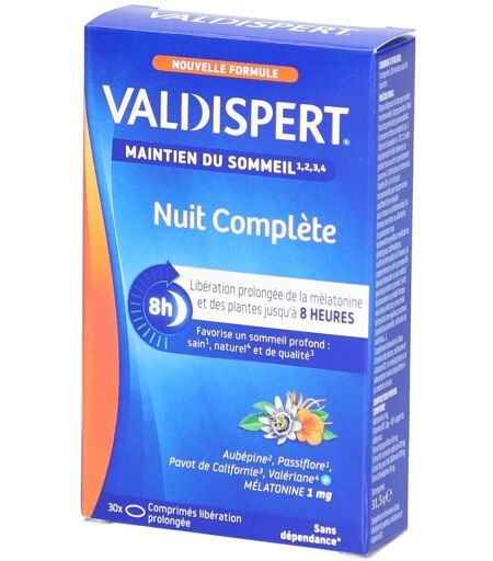 Complément alimentaire à utiliser dans le cadre d’une alimentation variée, équilibrée et d’un mode de vie sain.Prenez le contrôle de votre sommeil et offrez-vous enfin le sommeil dont vous avez besoin, avec le NOUVEAU Valdispert® Nuit Complète. Ce complément alimentaire fait partie de la gamme Valdispert® Maintien du sommeil : des produits spécialement conçus pour vous aider à ne pas vous réveiller en pleine nuit.Grâce à son comprimé à libération prolongée, les ingrédients se libèrent pendant 8 heures et aident à retrouver un sommeil réparateur2,4, et sans réveils nocturnes1,3. Il contient un mélange sur mesure d'ingrédients spécialement sélectionnés pour vous permettre de retrouver des nuits paisibles et réparatrices.(1) L'aubépine aide à réduire l'agitation et permet un meilleur sommeil. (2) La passiflore favorise un bon sommeil. (3) Le pavot de Californie favorise un sommeil de qualité. (4) La valériane aide à maintenir un sommeil naturel.Les produits Valdispert® sont sans dépendance ni accoutumance connues aux doses recommandées.BénéficesVeganSans colorantsSans glutenSans lactoseIngrédientsAgent de charge (hydroxypropylméthylcellulose, hydroxypropylcellulose), extrait sec de passiflore (Passiflora incarnata L.), extrait sec de valériane (Valeriana officinalis L.), stabilisant (alginate de sodium), extrait sec de pavot de Californie (Eschscholzia californica Cham.), extrait sec d'aubépine (Crataegus laevigata (Poir.)), stabilisant (gomme xanthane), antiagglomérants (stéarate de magnésium, dioxyde de silicium).Conseils d'utilisation1 comprimé à prendre avec un verre d'eau, 30 minutes avant le coucher.Précautions d'emploiNe pas utiliser chez les enfants de moins de 18 ans, les femmes enceintes et en cas d'allaitement. Pour les personnes sous traitement/surveillance médicale, demander l'avis d'un médecin avant de prendre ce produit. Peut altérer la capacité à conduire et à utiliser des machines.Poids net30 comprimésAdresse du FabricantCOOPERPlace Lucien Auvert77 020 Melun CedexFrance ...