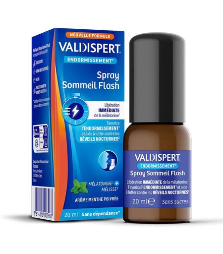 Complément alimentaire à utiliser dans le cadre d’une alimentation variée, équilibrée et d’un mode de vie sain.Prenez le contrôle de votre sommeil et offrez-vous enfin le sommeil dont vous avez besoin avec le spray Valdispert Sommeil Flash. Ce complément alimentaire fait partie de la gamme Valdispert Endormissement : des produits spécialement conçus pour favoriser un endormissement plus rapide. Grâce à son format spray pratique et nomade, il libère instantanément sa formule dans la muqueuse buccale, favorisant une action rapide dans l'organisme. Valdispert Spray Sommeil Flash contient un mélange unique d'ingrédients spécialement sélectionnés. Ainsi, 3 pulvérisations contiennent :Mélatonine 1,5 mg : contribue à réduire le temps d'endormissement. L'effet bénéfique est obtenu dès la prise d'1 mg de mélatonine avant le coucher ;Extrait de mélisse 120 mg : aide à une relaxation nocturne optimale et contribue à la qualité de votre sommeil.Valdispert offre une gamme complète de solutions pour le sommeil adaptées à vos besoins. Valdispert Spray Sommeil Flash est un produit de la plus haute qualité : sans sucre, sans gluten, sans lactose, sans colorant ni arôme artificiel, ingrédients vegan, sans dépendance ni accoutumance.Présentation disponible pour Valdispert Spray Sommeil Flash sur notre pharmacie en ligne : Spray buccal de 20 ml arôme menthe poivréeIngrédientsEau, émulsifiant (glycérol), extrait de feuilles de mélisse (Melissa officinalis L.), éthanol, phosphatidylcholine (SOJA), mélatonine, correcteur d'acidité (acide citrique), conservateur (sorbate de potassium), arôme (huile de menthe poivrée), édulcorant (sucralose)Allergènes : Soja.Conseils d'utilisationL'utilisation du spray sommeil flash Valdispert est strictement réservée à l'adulte. Bien agiter avant emploi puis effectuer 3 pulvérisations dans la bouche, 15 minutes avant le coucher. Une fois ouvert, utiliser dans les 3 mois.Précautions d'emploiComplément alimentaire ne remplaçant pas une alimentation variée et équilibrée ni un mode de vie sain.Déconseillé aux personnes souffrant d'une maladie auto-immune ou inflammatoire, d'une maladie épileptique ou asthmatique, aux femmes enceintes ou allaitantes, aux personnes souffrant de troubles de l'humeur, du comportement ou de la personnalité.Les personnes sous traitement/surveillance médicale doivent demander un avis médical avant de prendre ce produit.Evitez de consommer ce produit lorsque vous devez effectuer une activité nécessitant une vigilance soutenue (conduite automobile, utilisation de machines...).Usage ponctuel.Une consommation excessive peut avoir des effets laxatifs.Ne pas dépasser la dose journalière recommandée.Tenir hors de portée des enfants.A conserver dans un endroit sec, à l'abri de la lumière et à une température comprise entre 15 et 25 °C.Poids net20 mlAdresse du FabricantPlace Lucien Auvert, 77 020 Melun Cedex, France ...