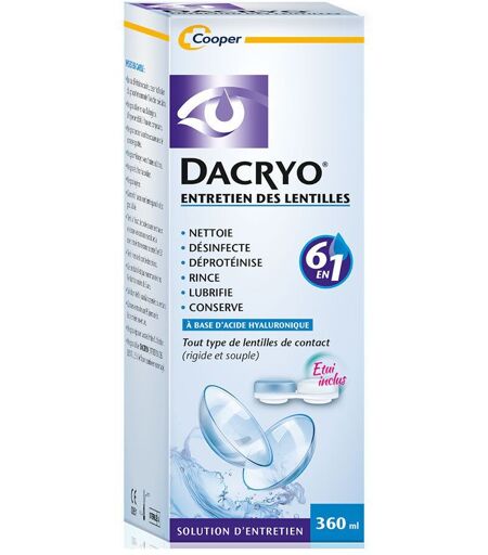 DACRYO® - Solution d'entretien des lentilles 6 en 1 Nettoie, désinfecte, déproténise, rince, lubrifie, conserve Lentilles de contact Acide Hyaluronique Etui inclus Flacon 360 ml De Conservation Et Nettoyage