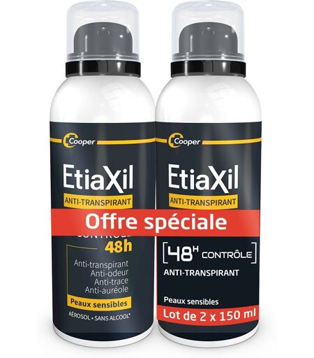 ETIAXIL - Déodorant Anti-transpirant HOMME Transpiration Modérée Aisselles Contrôle 48h Aérosol 150 ml Lot de 2 Spray 300