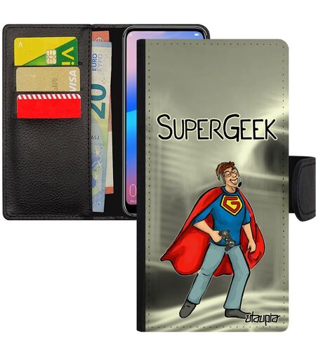 Coque Samsung S10 Plus Portefeuille Super Geek Design Heros Noir Gamer Mobile Bande Dessinée Play Texte Comics Drole Pochette Galaxy