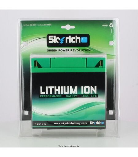 Batterie polymère Skyrich neuve haut de gamme au Litium référence 12C16A-3B / HJ51913-FP. Caractéristiques: - Longueur: 181mm - Largeur: 77mm - Hauteur: 170mm - Tension: 12V - Capacité: 7.2Ah - CCA: 450A - Bornes + à droite Les batteries Lithium sont ultra légères et sans aucun entretien. Elles conviennent parfaitement à tous les types de moto, quad, scooter et Jet-ski. Elles offres de nombreux avantages: 3 fois plus légère qu’une batterie classique au plomb, décharge faible et constante, recharge rapide en 6 minutes, durée de vie supérieure (le double par rapport à une batterie normale), performances parfaites mêmes à hautes températures et haute protection car non explosives et non combustibles. Conformes aux normes ISO9001, ISO14001, CE, UL certification et ROHS. La batterie lithium est la plus respectueuse pour l’environnement. Vendue à l'unité. Livrée conforme à la photo. ...