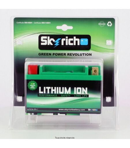 Batterie polymère Skyrich neuve haut de gamme au Litium référence YTX7A-BS / HJTX7A-FP-S. Caractéristiques: - Longueur: 145mm - Largeur: 86mm - Hauteur: 90mm - Tension: 12V - Capacité: 2.4Ah - CCA: 130A - Bornes + à gauche Les batteries Lithium sont ultra légères et sans aucun entretien. Elles conviennent parfaitement à tous les types de moto, quad, scooter et Jet-ski. Elles offres de nombreux avantages: 3 fois plus légère qu’une batterie classique au plomb, décharge faible et constante, recharge rapide en 6 minutes, durée de vie supérieure (le double par rapport à une batterie normale), performances parfaites mêmes à hautes températures et haute protection car non explosives et non combustibles. Conformes aux normes ISO9001, ISO14001, CE, UL certification et ROHS. La batterie lithium est la plus respectueuse pour l’environnement. Vendue à l'unité. Livrée conforme à la photo. ...