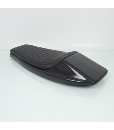 Selle biplace neuve avec support type Flat Track coloris noir et coutures noires. Le support de selle en plastique noir est brut à peindre, il est équipé d'une mousse d'épaisseur 20mm recouverte d'un simili-cuir type skaï noir collé et cousu selon un motif à matelassage dans la largeur. Sa fixation est possible sur de nombreux cadres de moto grâce aux deux points de fixation au dessous, garantis par des inserts filetés M6 intégrés à la selle (côtes sur la photo). Vendue nue sans visserie. Livrée conforme aux photos. ...