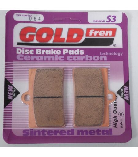 Plaquette de frein métal fritté GOLD Fren type 064 qualité S3 neuve. Dimensions: - Longueur: 69.5mm - Largeur: 50.9mm - Épaisseur: 8mm Vendues par paire. Livrées conforme à la photo. ...