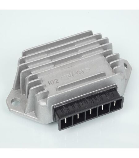 Régulateur redresseur de tension 12V 80W neuf de marque RMS, équipé d'un connecteur à cinq broches. Dimensions : - Largeur totale hors tout 65mm. - Longueur totale hors tout 106mm. - Épaisseur totale hors tout 30mm. - Diamètre des trous de fixation 8mm. - Entre axe des trous de fixation 92mm. Pour le remplacement de la référence d'origine Piaggio 2308245. Vendu à l'unité. Livré conforme à la photo. ...