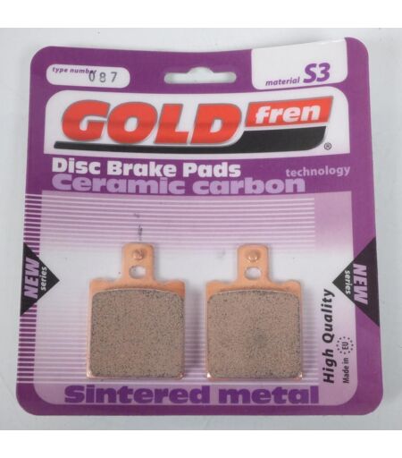 Plaquettes de frein métal fritté GOLD Fren type 087 qualité S3 neuves. Dimensions : - Longueur : 56.4mm. - Largeur : 39.8mm. - Épaisseur : 9.3mm. Vendues par paire. Livrées conformes à la photo. ...