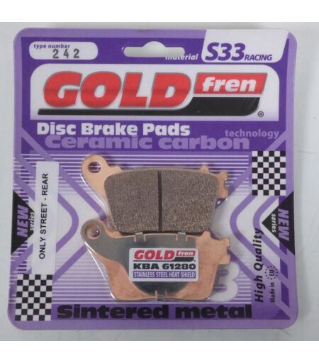 Plaquette de frein métal fritté GOLD Fren type 242 qualité S33 Racing neuve. Dimensions: - Longueur: 85.7mm - Largeur: 40mm - Épaisseur: 8.9mm Vendues par paire. Livrées conforme à la photo. ...