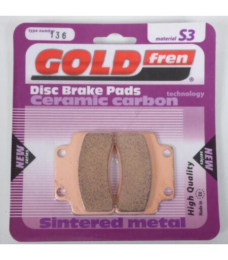 Plaquette de frein métal fritté GOLD Fren type 136 qualité S3 neuve. Dimensions: - Longueur: 59.6mm - Largeur: 43.7mm - Épaisseur: 9.1mm Vendues par paire. Livrées conforme à la photo. ...