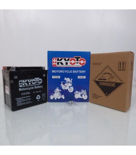 Batterie Kyoto acide conventionnelle au plomb neuve sans entretien vendue avec acide référence YIX30L. Caractéristiques: - Longueur: 166mm - Largeur: 126mm - Hauteur: 175mm - Tension: 12V - Capacité: 30Ah - CCA: 385A - Bornes + à droite - Volume acide: 1.55L Cette batterie offre un excellent rapport Qualité/Prix. Elle est facile à mettre en place. Une notice d'utilisation est fournie. Vendue à l'unité. Livrée conforme à la photo. ...