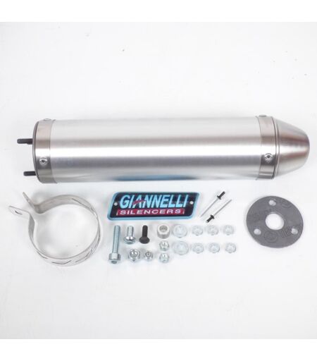 Silencieux d'échappement homologué neuf de marque GIANNELLI finition aluminium pour moteur 2 Temps. La fixation s'effectue par trois vis diamètre 6mm entre axe 40mm. Vendu avec sa visserie de fixation et son collier. Livré conforme aux photos. ...