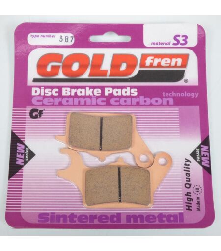 Paire plaquettes de frein métal fritté Gold Fren type 387 qualité S3 neuve. Vendues par paire. Livrées conforme à la photo. ...